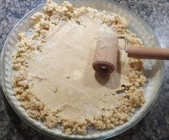 Teig ausrollen, in eine gefettete, bemehlte Tartform geben. Mit der Gabel mehrmals in den Teig stechen damit sich beim Backen keine Blasen bilden.