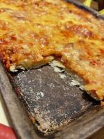Wir mögen den Teig recht dünn auf dem Backblech, darum verwende ich für ein Backblech auch "nur" 350 g Mehl.