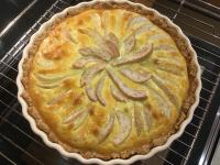 Nach Ablauf der Vorbackzeit den zerkleinerten Schinkenspeck und die Gorgonzolawürfel auf dem vorgebackenen Teig verteilen. Die Birnenspalten schuppenförmig auf dem Teig verteilen. Eimasse darüber geben und im Backofen bei 180 Grad 35 Minuten fertig backen.
