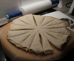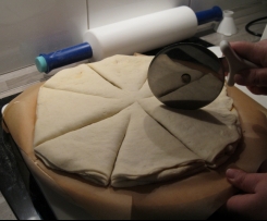 Die dritte Platte auflegen und mit dem Pizzaroller "Tortenstücke einschneiden, in der Mitte den Teig jedoch nicht durchtrennen. Erst Vierteln, dann Achteln.