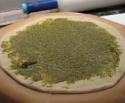 Die erste Platte mit grünem Pesto bestreichen, dabei etwas Rand frei lassen.
