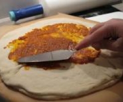 Nach dem Gehen den Teig nochmal kurz durchkneten und in drei Teile teilen (bei mir ca. 285 g). Die Teigstücke jeweils zu gleichgroßen runden Platten ausrollen.