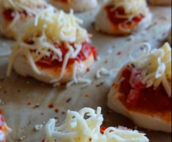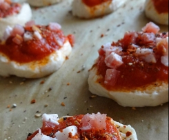 Je 2-3 TL Tomatensauce darauf verteilen. Mit Schinkenspeckwürfeln (Blattspinat, Salami- / Chorizo-Würfel etc.), etwas Chiliflocken und Käse bestreuen. Im heißen Ofen 20–25min. backen.