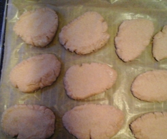 - Den Teig aus der Schüssel nehmen und zu einer Rolle formen. Ich habe 10 Scheiben daraus geschnitten und diese einfach etwas platt gedrückt auf den mit Backpapier belegten Rost gelegt und eine leichte Kuhle eingedrückt. Die Fladen 6 Min. vorbacken.