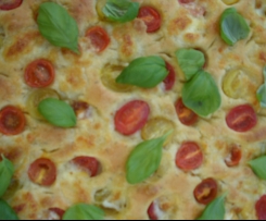 Die Krischtomaten (oder Cocktail- oder Datteltomaten, was eben da ist), halbieren und mit der Schnittfläche nach oben in den Teig drücken. Den Mozarella in kleine Würfel schneiden und ebenfalls über die Focaccia streuen. Für ca. 30 Min bei ca. 200°C in den Ofen geben.