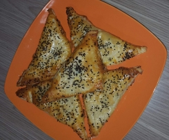 "Mixtopf geschlossen" geben und etwas klein mixen und auf die Quadrate geben. Dann zu Dreiecke zusammen falten und die Ränder mit einer Gabel gut zusammen drücken, damit die Fülle beim backen nicht raus läuft. Dann ein Eigelb verquirlen und die Dreiecke damit einstreichen. Dann je nach Belieben den Schwarzkümmel darauf verteilen und im Backofen bei 180 Grad goldbraun backen. Die Blätterteigtaschen können warm und kalt gegessen werden.