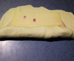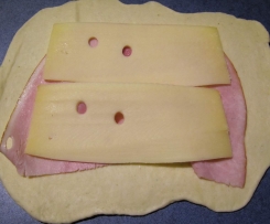 Die Teigstücke jeweils ca. 15 x 10 cm ausrollen und mit den Schinken- und Käsescheiben belegen.