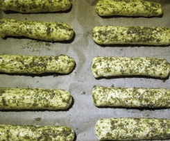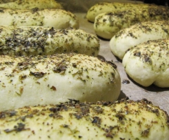 Die Teiglinge mit der Naht nach unten auf einem mit Backpapier belegten Backblech verteilen und mit der Öl-/Kräutermischung bepinseln (frische Kräuter eignen sich nicht, da diese beim Backen verbrennen würden). Wer mag, kann noch etwas geriebenen Parmesan darüber geben.