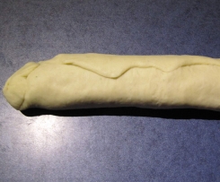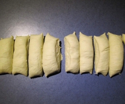 Den gegangenen Teig zu einer Wurst formen und in 10 Stücke teilen.