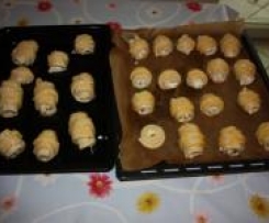 "Mixtopf geschlossen" 4 sek./stufe 5 zerkleinern. Eiweis zufügen 1 min./stufe 2 rühren. Füllung auf den Teig verteilen. Wie Hörnchen aufrollen. Mit Eigelb bestreichen .Vorgeheitzten Backofen 175°C Umluft ca. 20-30 min Goldgelb Backen