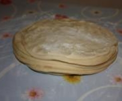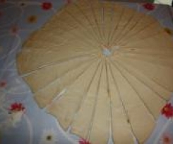 Das gestapelte Teig ein bischen mit Mehl bestäuben und mit den Händen platt drücken anschließend mit den Teigrolle aufrollen so dünn wie möglich. Teig mit den Messer Vierten achteln u.s.w.