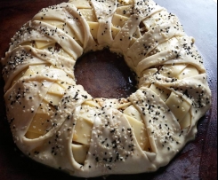 Nun nehme ich das erste Teigdreieck an der Spitze in die Hand, ziehe es hoch und drehe es einmal rechts um sich rum und lege das Ganze dann über die Füllung. Mit den anderen Teigstücken verfahre ich genauso. Mit Eigelb bestreichen, Sesam und Schwarzenkümel drauf streuen.