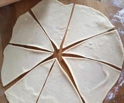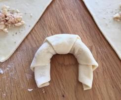 - Die Dreiecke von außen nach innen rollen, die Enden zur Dreiecksspitze drehen und so zu Kipfel / Hörnchen formen.