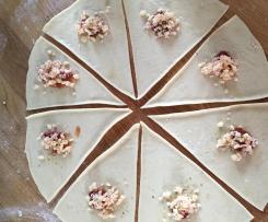 - Jedes Dreieck mit einem Klecks Ketchup, etwas Käse-Schinken-Füllung und Oregano belegen.