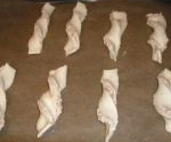 Die einzelnen Stücke drehen - gab bei mir zwei Bleche je 8 Kringel - und ab in den vorgeheizten Backofen und bei Heissluft 180° ca. 20-25 Minuten backen.