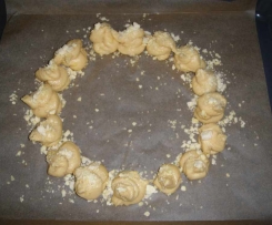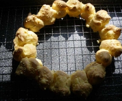 Mit Esslöffeln oder mithilfe eines Spritzbeutels (habe einfach eine Plastiktüte mit abgeschnittener Spitze verwendet) den Brandteig als Kranz oder einzeln auf ein Backblech setzen. Mit dem restlichen 25 gr. geriebenen Käse bestreuen und im vorgeheizten Backofen bei 180° ca. 30 Minuten backen. WICHTIG: Backofen zwischendurch nicht öffnen, da das Gebäck sonst zusammenfällt.