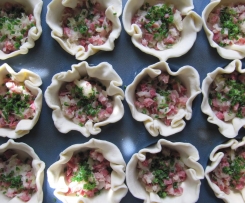 Das Rezept stammt aus der Zeitschrift Chefkoch. Diese Mini-Quiches schmecken warm und kalt. Wer sie fleischlos möchte, kann den Schinken durch gewürfelte, getrocknete Tomaten ersetzen (laut Tipp in der Zeitschrift).