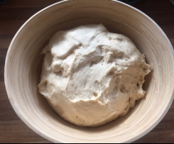 Teig in eine bemehlte Schüssel geben und ca. 45 Minuten an einem warmen Ort gehen lassen, bis sich das Volumen verdoppelt hat.