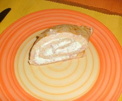 Das Blech aus dem Ofen nehmen und 200 g Frischkäse auf dem heissen Pfannkuchen verstreichen, von der kurzen Seite aufrollen und in ca. 3 cm dicke Scheiben schneiden.