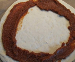 Teig in eine Schüssel umfüllen und zugedeckt an einem warmen Ort gehen lassen, bis der Teig deutlich aufgegangen ist. - Den Teig in 2 - 4 Portionen teilen und jeweils rund ausrollen. Tomatensauce kreisförmig verteilen.