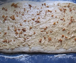 Hefeteig zu einem Rechteck von ca. 50 x 30 cm ausrollen und mit der Margarine-Zwiebelsuppe-Mischung bestreichen, evtl. mit Röstzwiebeln bestreuen. - Den Teig von der schmalen Seite her aufrollen. Die Rolle der Länge nach halbieren.