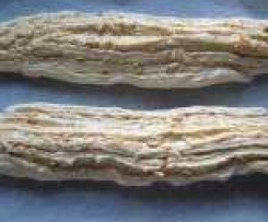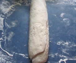 - Die zwei Teile mit der aufgeschnittenen Seite nach oben auf ein mit Backpapier ausgelegtes Backblech legen und ca. 20 Min. gehen lassen.