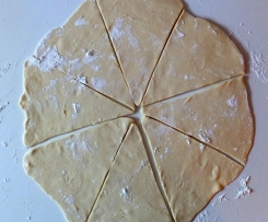 Von der Aussenseite zur Spitze hin aufrollen und auf ein mit Backpapier belegtes Blech legen.