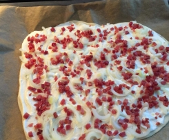 Super schneller einfacher Flammkuchen. Auf den steinen von p.....c...wird er sehr schön knusprig.