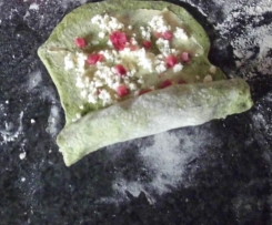Von der schmalen Seite aufrollen und auf ein mit Backpapier belegtes blech geben und abgedeckt 1 Std. gehen lassen.