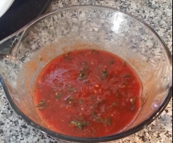 Basilikumblätter für 2 Sek./Stufe 5 im Mixtopf zerkleinern. Dazu die 400 g Pizzatomaten, die Gewürze Salz, Pfeffer, Zucker und Pizzagewürz geben und 3 Sek/Stufe 3 kurz vermischen.