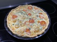 zu einem glatten Teig kneten, Teig in Klarsichtfolie wickeln und ca. 1 Std. im Kühlschrank kühlen.In der Zwischenzeit eine Tarteform fetten und mit Mehl bestauben sowie die Zucchini und Tomaten waschen und in dünne Scheiben schneiden.