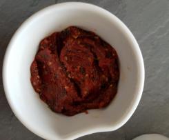 1. Eine Schüssel auf den Mixtopfdeckel stellen und Ajvar mit Pizzagewürz einwiegen (Ersatzweise kann man auch Tomatenmark mit roter Curry-Paste vermischen) Bei uns kommen immer noch frische Kräuter dazu