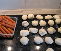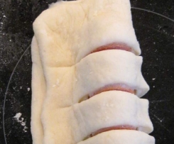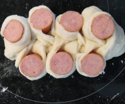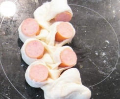 Ein bißchen wie "Würstchen im Schlafrock" ! Schmecken auch kalt. Am besten geeignet sind kurze Würstchen, ich hatte eine Packung mit 22 Stück.
