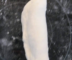 Nun das Würstchen mit dem Teig durchschneiden, die Naht zusammen lassen.