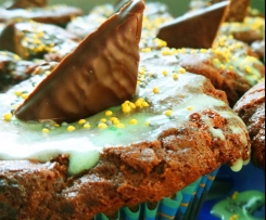 Muffins aus dem Ofen nehmen und auskühlen lassen. Puderzucker mit 1 EL Wasser verquirlen, ein paar Tropfen grüne Lebensmittelfarbe hinzufügen und ohne Klümpchen verrühren, dann über die Muffins streichen und mit je 1/2 After-Eight (diagonal geteilt, mit der Schnittfläche in den Muffin gesteckt) und Zuckerperlen bestreut garnieren.