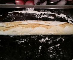- Den Teig auf einer bemehlten Arbeitsfläche zu einem Rechteck von ca. 40 x 50 cm ausrollen und mit der Zimtfüllung bestreichen und aufrollen.