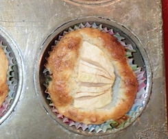Den Apfel für den Belag schälen und entkernen und je nach Größe in Viertel oder diese noch einmal quer in Achtel teilen und in jedes Förmchen ein Stück geben. Nach dem Backen ist der Apfel ein wenig eingesunken und erzeugt so ein kleines Loch, das dann mit dem Frosting aufgefüllt wird.