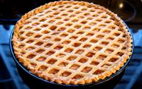 Apfelfüllung hineingeben und leicht flach drücken, aus dem anderen Teigkreis 2 cm breite Streifen schneiden und gitterartig auf die Füllung legen.