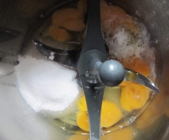 "Mixtopf geschlossen" einsetzen. Eier, heißes Wasser und Zucker in den