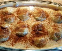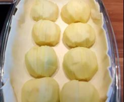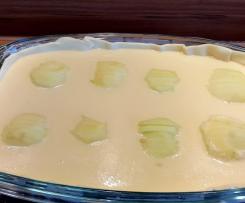 - 4 Äpfel halbieren, entkernen, schälen, in Streifen schneiden und als Halbkugeln, auf den Teig setzen.