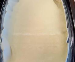 - Eine 20 x 30 cm große Form, mit Butter einfetten, den Blätterteig rein legen, etwas andrücken und den überstehenden Rand abschneiden.