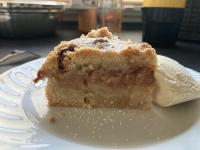 Die Apfelscheiben darauf verteilen. Die Apfelmasse darauf verteilen und glattstreichen. Aus dem restlichen Teig Streusel formen und auf dem Kuchen verteilen.