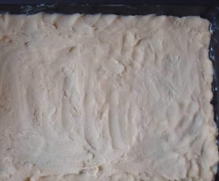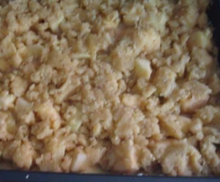 Masse kurz abkühlen lassen, mit den Händen zu Streuseln zerbröseln und auf dem Kuchen verteilen.