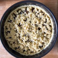 Die Hälfte des Teiges/Streuselteig (430 g) in den Gefrierschrank stellen, bis er gebraucht wird (läßt sich dann besser bröseln).