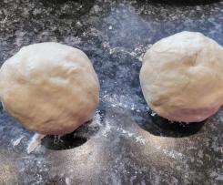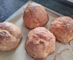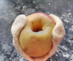 Den Backofen auf 180°C vorheizen und ein Backblech mit Backpapier auslegen. - Wenn der Teig etwas aufgegangen ist, teilst du für jeden Apfel etwas Teig ab, rollst ihn etwas aus, oder drückst ihn etwas mit der Hand platt und setzt den Apfel darauf. Darauf achten, dass der Teig um den Apfel nicht zu dick wird. Mit Hilfe eines Trichters kannst du den Apfel mit etwas Zimt-Zucker-Mischung und gehackten Nüssen, optional mit Rosinen füllen, nicht zu voll, denn jetzt muss der Teig um den Apfel geknetet werden bis er komplett geschlossen ist.