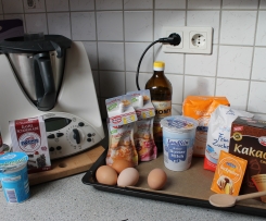 Öl, Buttermilch und Kakao langsam auf dazu geben bei ST2 - Mehl und Backpulver dazu geben und kurz unterrühren. 5sek/St3 evtl. wiederholen