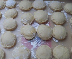 Aus dem Teig in 2-3 Arbeitsschritten jeweils eine Teigplatte von etwa 0,5 cm staker Dicke ausrollen. Mit einem Glas, oder einer Tasse ca. 40 Kreise mit einem Durchmesser von 6-7 cm ausstechen.