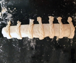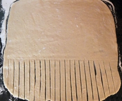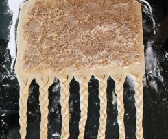 Den Teig auf einer Seite ca 1/3 vom Ganzen in Streifen schneiden. Am besten in so viele Streifen, dass die Anzahl durch drei teilbar ist.