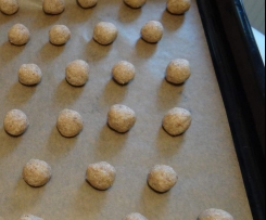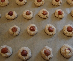 Den Teig zu kleinen Kugeln formen (Größe Marzipankartoffeln).Nuss draufsetzen und im vorgeheizten Backofen bei 180°C und Umluft ca. 15 min backen.