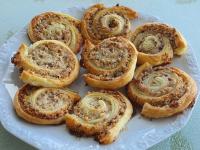 Die 1. Blätterteigrolle ausbreiten. Die Masse raufgeben, gleichmäßig verteilen und den zweiten Blätterteig darauf legen. Jetzt einfach ca 1,5cm breite Bahnen schneiden und anschließend einrollen zu kleinen Schnecken. Diese gleich auf ein Backblech mit Backpapier legen und dann für 20-25 Minuten ab in den Ofen .